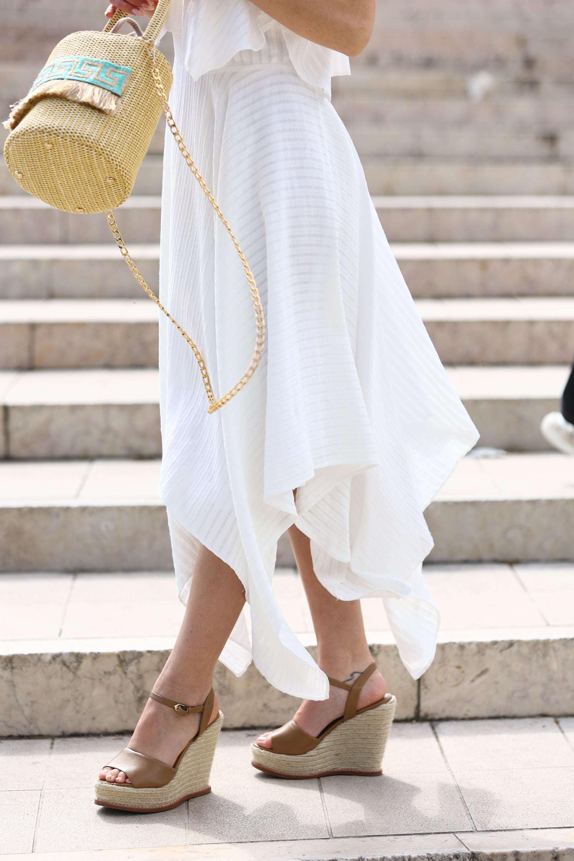 Vestido midi branco com alças finas e desenho assimétrico. Este modelo se destaca pelo tecido leve de linho com listras texturizadas, que proporcionam um toque de sofisticação e frescor. O decote arredondado é complementado por um babado sobreposto que confere volume e movimento, criando um efeito romântico. A saia assimétrica com bordas irregulares oferece um estilo fluido e dinâmico, ideal para dias quentes ou eventos casuais.