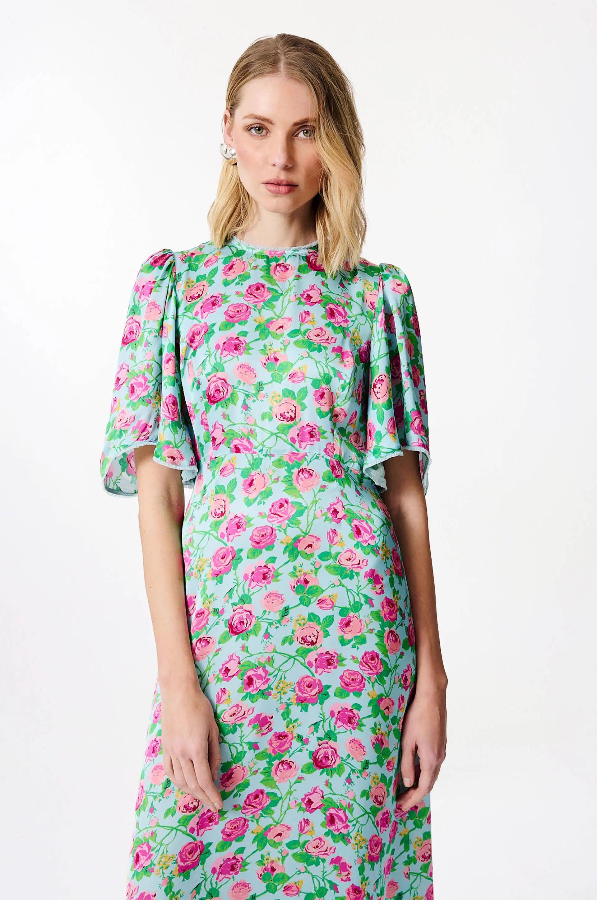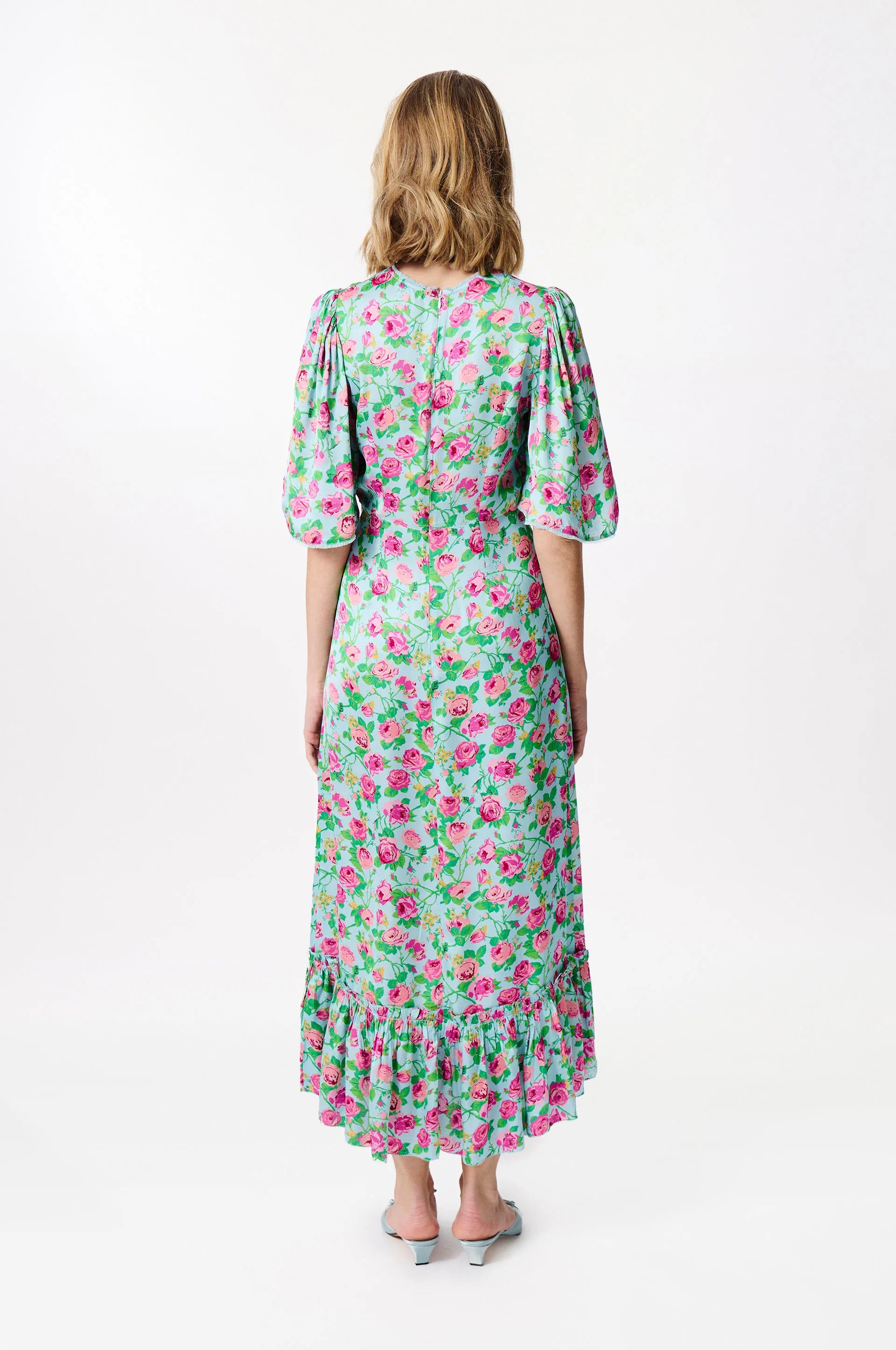 Este vestido comprido e fluído, é realçado por um estampado de rosas em toda a peça. Apertado na cintura, cria uma silhueta elegante e romântica, aliando leveza.